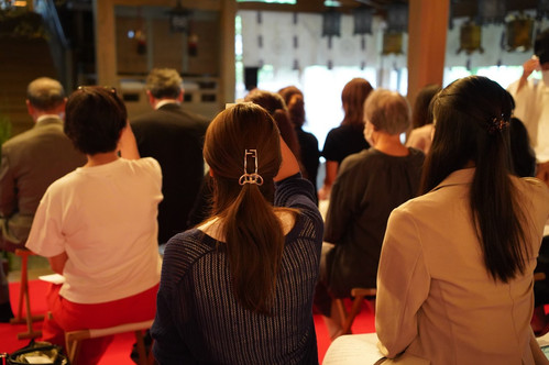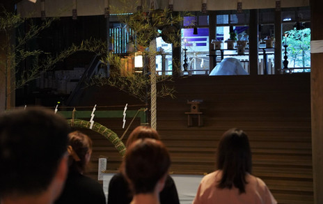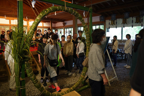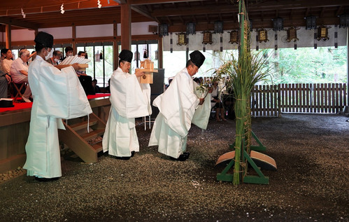 6月30日 梅雨の最中、14時より夏越大祓式を斎行致しました。雨天にもかかわらず御神縁のもと80名近くの皆様が御参列下さり、形代、お配り致しそれぞれに心身の穢れを祓い清め、全国各地の御崇敬各位よりお送り頂きました形代と合わせ神前に奉り、祝詞、大祓詞を奏上し、その後、先ず神職が茅の輪くぐりの唱え詞を唱えながら茅の輪を潜り、引き続き参詣者の皆様が無病息災を祈り茅の輪をお潜り下さいました。
